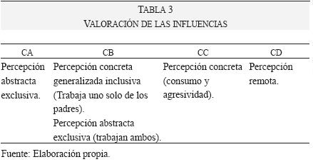 Valoración de las influencias. Las familias de clase alta tienen una percepción abstracta exclusiva de las influencias. Son conscientes de que la televisión es una fuente de influencia, pero ellos mismos se excluyen de ser objeto de las mismas. Las familias de clase media-media en las que ambos padres trabajan fuera de casa manifiestan en sus discursos una posición muy parecida a la que acabamos de describir. En el caso de familias de esta misma clase en las que solo trabaja uno, en la mayoría el padre, tienen una percepción concreta inclusiva de las influencias de los medios. Son muy conscientes de la posibilidad de que la televisión influya negativamente en ellos y en sus propios hijos pudiendo fomentar conductas que no serían aceptadas por los padres. Además, describen de forma concreta actitudes en sus propios hijos que consideran efecto de los contenidos televisivos a los que se exponen habitualmente. Las familias de clase media-baja también tienen una percepción concreta inclusiva, con la diferencia de que en este caso las situaciones de influencia que expresan en la mayoría de los ejemplos están relacionadas con el consumo. Las familias de clase baja tienen una percepción remota de las influencias. No tienen ideas claras sobre este término ni les preocupa especialmente. En algunas ocasiones aluden a cómo la televisión incita al consumo o a la agresividad.