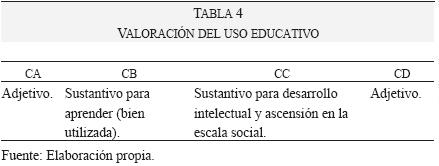 Valoración del uso educativo. Las familias de clase media-alta, a diferencia de las de clase media-media, no consideran que la televisión sea o pueda ser un medio educativo en sí mimo. Para ellos la televisión puede convertirse en instrumento educativo, adjetivo, es decir, complementario, en casos muy concretos. En la clase media-media sí consideran que la televisión podría tener un uso educativo, sustantivo, y de hecho, se sienten traicionados porque el medio no cumple con sus verdaderas funciones: la información, que valoran más positivamente, y la formación.