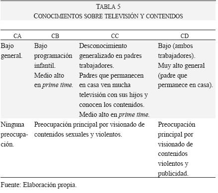 Conocimiento sobre televisión y contenidos. El conocimiento que tienen los padres sobre la programación infantil que ven sus hijos es muy escaso o prácticamente nulo. Los padres, en general, confían en que la programación que emiten algunas cadenas en las franjas que destinan a los niños (sobre todo las mañanas de los fines de semanas) y la programación que emiten los canales temáticos infantiles son adecuados para la edad de los hijos. Las diferencias vienen en el conocimiento de la programación en horario de prime time, franja en la que más se ve televisión en familia, y en la que los padres, disponen de más tiempo para dedicarlo a la televisión por lo que suelen conocer mejor la programación que emiten las diferentes cadenas. Aunque padres e hijos no vean lo mismo y cada uno haga el visionado en televisiones diferentes, sí es una programación que en líneas generales los padres conocen. En el modelo de familia de clase alta el desconocimiento es generalizado. En las familias de clase media-media, desconocen la programación infantil pero manifiestan tener un conocimiento más elevado de la franja de prime time. Las clases medias-medias manifiestan lo mismo. En el modelo de familia de clase baja el conocimiento es muy bajo en los hogares en los que ambos padres trabajan, o en el caso del padre o madre trabajador, pero en cambio, cuando los padres permanecen en casa el conocimiento es muy alto porque dedican mucho tiempo al visionado de televisión y lo comparten con los hijos.