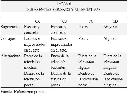 Sugerencias, consejos y alternativas. Las sugerencias sobre televisión son muy escasas o prácticamente inexistentes. Es curioso contrastar cómo las familias tienen criterios claros sobre televisión pero según sus propios discursos no ofrecen a sus hijos sugerencias y consejos sobre el uso que deberían hacer del medio. En algunos casos se hacen sugerencias concretas sobre algún programa específico que se ha visto anunciado, pero estos son la excepción; en cuanto a los consejos sobre televisión ocurre lo mismo.