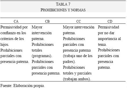 • No existen normas o prohibiciones sobre televisión en los hogares. Se percibe temor por parte de los padres a ser autoritarios y a intrometerse en la libertad individual de sus propios hijos. Los padres solo reaccionan frente a un exceso en el tiempo de consumo diario y cuando se percatan de que están viendo contenidos con una alta carga erótica o sexual y frente a imágenes violentas. No existen normas permanentes sino mandatos arbitrarios y transitorios; arbitrarios porque son fruto de una reacción no planificada sino casual, y transitorios porque por la forma en que son impuestas en un momento determinado no tienen permanencia en el patrón de conducta de los hijos.