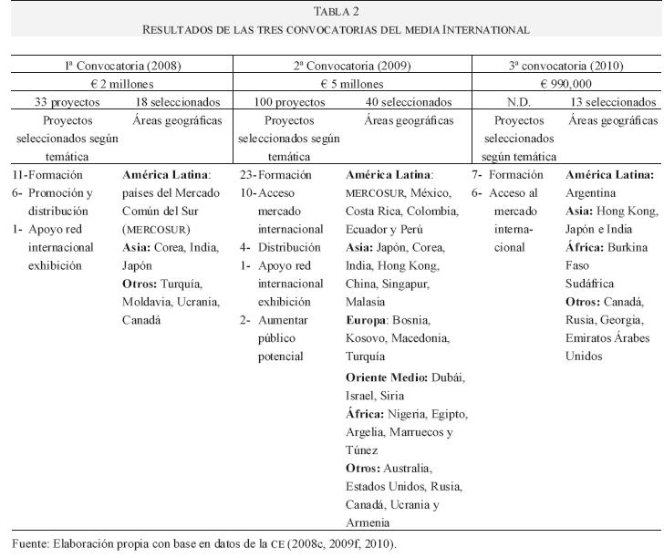 La acción preparatoria MEDIA International tuvo por objetivo financiar actividades de cooperación entre los profesionales europeos del sector audiovisual y sus homólogos de terceros países bajo una base de beneficio mutuo. La duración fue de tres ediciones (2008-2010). Al igual tuvo como finalidad alentar la creación de un flujo bidireccional de obras audiovisuales a nivel de mercados internacionales. Este programa sirvió para preparar el camino al nuevo programa MEDIA Mundus, que se activó en 2011 hasta 2013. El presupuesto fue de 8 millones de euros, distribuidos en tres ediciones tal y como nos presenta la Tabla 2. Es una muestra clara de la voluntad de la CE de dar mayor protagonismo a la dimensión exterior, sobre todo teniendo en cuenta que en el mercado global el audiovisual europeo puede encontrar nuevos aliados y otras vías de comercialización que el mercado interno europeo no le está facilitando. De entre los proyectos concedidos, se observa una gran diversidad de terceros países. Hay que mencionar que en las tres convocatorias participaron países latinoamericanos, en especial, los integrantes del MERCOSUR.