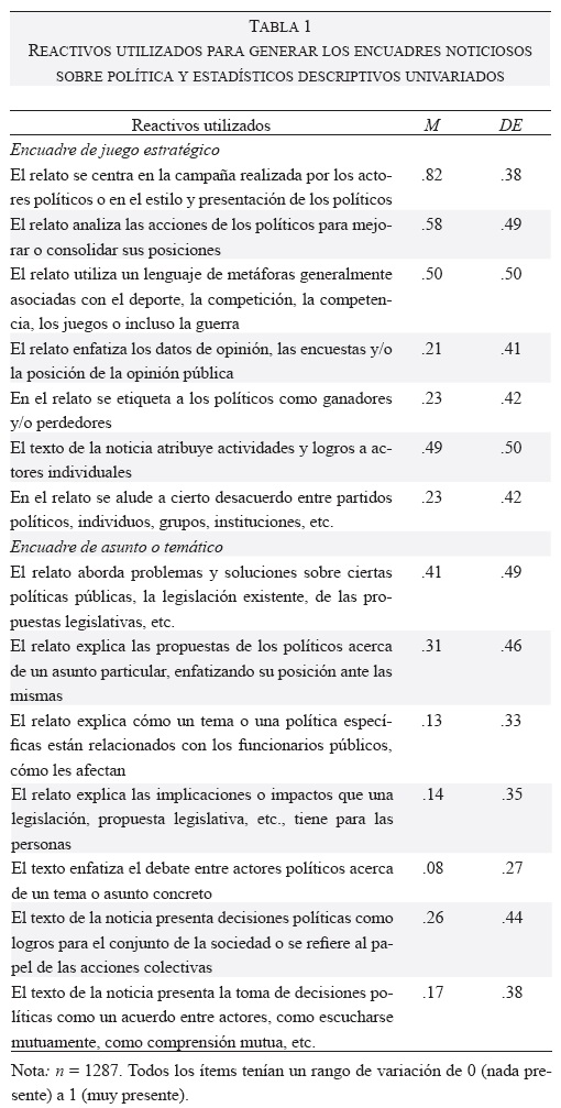 3. Encuadres noticiosos de la política. Para analizar el tratamiento informativo que las notas informativas de la prensa digital ofrecieron a la campaña electoral mexicana de 2012, se elaboró una escala a partir de diferentes estudios previos. Así, se tomaron como referencia los estudios realizados previamente donde se han analizado los encuadres de política, tanto de asunto o temático (issue frame) como de juego estratégico (strategic game frame) (Aalberg et al., 2012; Cappella & Jamieson, 1997; Dimitrova & Strömbäck, 2012; Elenbaas & de Vreese, 2008; Lawrence, 2000). En total se utilizó una escala de 14 reactivos relacionados con la información de la campaña electoral, medidos con una escala dicotómica de 0 (no presencia) a 1 (presencia), a partir de los cuales se generaron los dos indicadores de encuadres de política (véase Tabla 1).