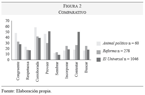 La muestra seleccionada consistió en tres plataformas digitales de noticias que incluyó dos de los periódicos nacionales más importantes e influyentes: El Universal y Reforma, así como el periódico digital Animal Político. Los criterios para seleccionar estos tres medios digitales fueron, primero, que son tres de las plataformas digitales de noticias nacionales que atraen mayor número de usuarios y visitantes en la capital y que cuentan con lectores en todo el país; segundo, que se enfocan de manera consistente en temas públicos sobre política, elecciones, comunidad, política pública, corrupción y problemas sociales, y tercero, que adoptan al menos algunas de las características esenciales del periodismo, como: rigor, exactitud, imparcialidad, independencia y transparencia.