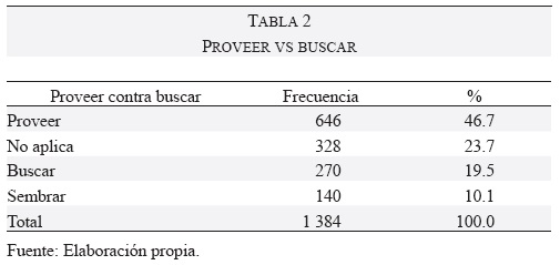 Otras categorías que se codificaron fueron: "proveer contra buscar" (en qué medida los participantes impulsan sus propias ideas contra la búsqueda de información en comentarios hechos por otras personas continuando el proceso de discusión) y "sembrar," para referirnos a mensajes que siembran una nueva idea de discusión y proveen las bases para un hilo de mensajes incluso cuando tiempo después, no haya evidencia de que esto haya sucedido. La Tabla 2 muestra que casi la mitad del número total de comentarios solo provee información en forma de opiniones.