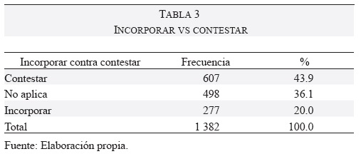 Otro segmento de categorías que se codificó fue "incorporar contra contestar". En este análisis buscamos evidencia de la incorporación de ideas de otros, ya sea expertos o ciudadanos, contra mensajes de impugnación simplemente contestando comentarios previamente publicados. La Tabla 3 muestra cómo el incorporar información adicional es una práctica poco común entre los participantes.