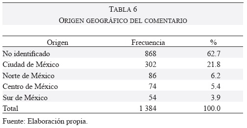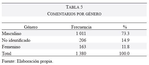 Para tener información en relación con la diversidad de los públicos y de su participación en estas plataformas, hemos codificado el origen y género del autor de cada uno de los comentarios (cuando estuvieron disponibles), así como los temas que más llamaron la atención de los usuarios. Carpentier (2009) argumenta que en el caso de los nuevos medios, las audiencias "regulares" han permanecido bajo investigación debido al énfasis en la participación activa. Para Strömback (2006), en todas las democracias contemporáneas las noticias están orientadas hacia las palabras y acciones de las élites. La Tabla 5 muestra que en México, los usuarios masculinos son más propensos a comentar en las tres plataformas informativas. En cualquier caso, el predominio de los comentaristas hombres sobre las comentaristas mujeres puede indicar una preferencia en la discusión pública en relación con asuntos políticos nacionales en favor de uno de los géneros, dejando al otro con menos posibilidades de influenciar y moldear las deliberaciones y decisiones en la esfera pública. No es claro si las causas de este desequilibrio sean internas a los sitios de noticias (falta de mujeres periodistas o la inclusión de temas importantes desde un diferente punto de vista orientado a los hombres en cuanto a la presentación y discusiones de los artículos se refiere) o externa (socialización de las mujeres en México, diferentes culturas capitales para cada uno de los géneros, el acceso a Internet entre hombres y mujeres en el país, entre otros). Sin embargo, el resultado es la participación desigual en los debates públicos acerca de asuntos políticos nacionales (al menos en su versión limitada al ofrecer noticias, opiniones y comentarios acerca de las noticias del día) de acuerdo con el género.