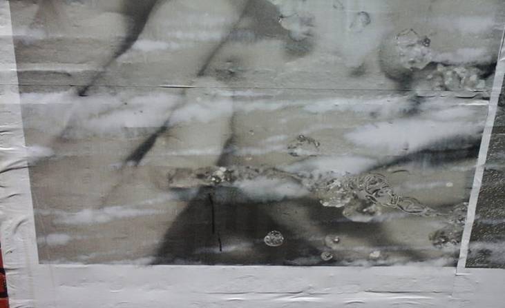 Este pequeño estudio empieza con la imagen 20140710-1,9 en la que se aprecia un primerísimo plano del rostro de una persona y gotas de agua suspendidas gracias a la iluminación y velocidad de obturación fotográficas adecuadas. El cartel considera otra imagen que no es posible reconocer debido al deslave del agualluvia. Esta doble condición -la de una imagen reconocible y la de una imagen fotográfica de la que solo perduran los restos de su disolución- es interesante, tal como se subrayará más adelante. Por lo pronto interesa atender el medio de comunicación y no el contenido fotográfico mismo.