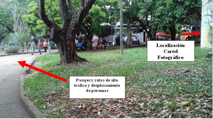 Una primera aproximación al análisis situado y descriptivo del medio empieza examinando el lugar donde está localizado el cartel fotográfico. Llega a un entorno rico en medios preexistentes: el muro, el edificio de cuatro pisos, un ambiente expuesto a la luz solar, el agua, la humedad y la acción de agentes vivos (personas, animales, bacterias), y una esquina rica en circulación y flujo de personas. Es quizás uno de los entornos más intensos en tráfico de personas en la Universidad: además de ser el lugar de tránsito hacia siete edificios de aulas y facultades, está cerca de un espacio de estacionamientos, la cafetería central, el coliseo, el centro deportivo y una plazoleta.