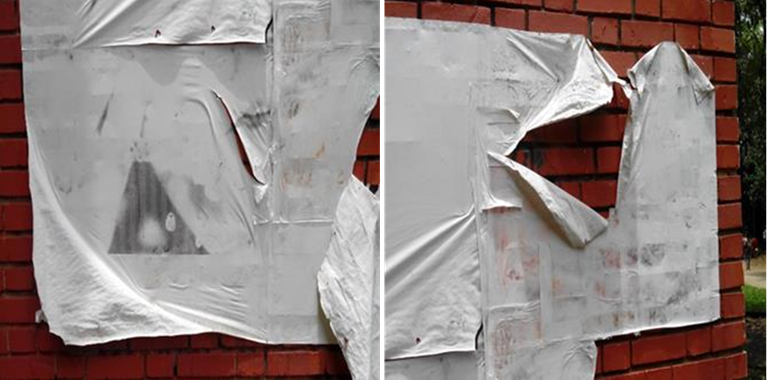 El cartel fotográfico de estudio apareció pegado en una de las paredes del edificio del Instituto de Educación y Pedagogía, en alguna fecha entre junio y agosto de 2014. Es la única pieza en esa pared. En paredes laterales se aprecian un pequeño mural y algunos grafitos. Pero este cartel fotográfico estaba -por decirlo de manera gráfica- a solas. El primer registro fotográfico de la pieza se realizó el 7 de noviembre de 2014 (Figura 3, izquierda) y el último el 9 de marzo de 2015 (Figura 3, derecha); es decir cuatro meses después. En total hubo 42 registros (poco más de dos por semana).