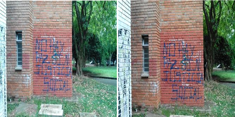 El viernes 12 de junio de 2015 fue tomada la última fotografía del medio descrito en este seguimiento. En el lugar quedaban algunos vestigios del cartel y un grafito nuevo: “No hay paz sin justicia social”. Para cerrar este seguimiento discutiremos varios asuntos revelados en esta pequeña escena final (Figura 9).