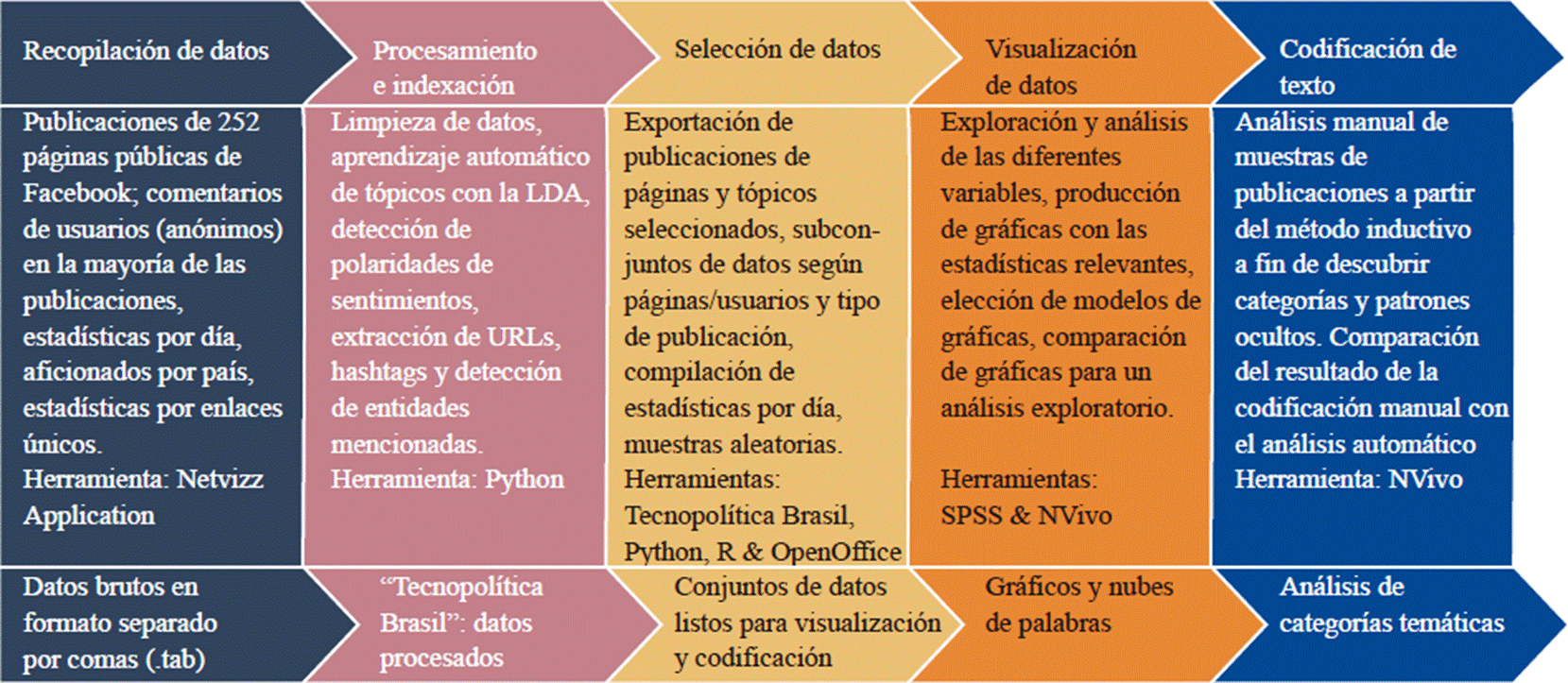 El abordaje cualitativo manual sigue un enfoque inductivo para analizar el contenido de una muestra aleatoria del 5% de las publicaciones de cada página (videos, fotos, enlaces y actualizaciones de estado), así como de todos los eventos de Facebook publicados en sus perfiles (n = 240). Así, 83 publicaciones de Papo Reto, 84 de Ocupa Alemão y 97 de Maré Vive fueron codificadas. Estas 264 publicaciones se analizaron utilizando el software de análisis cualitativo NVivo. En la Figura 1 presentamos el resumen de la metodología aplicada.