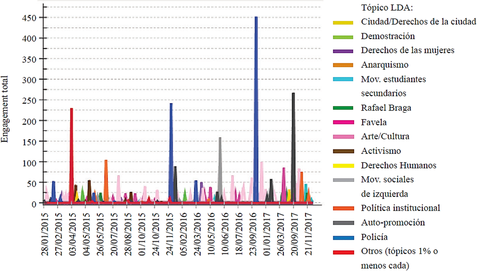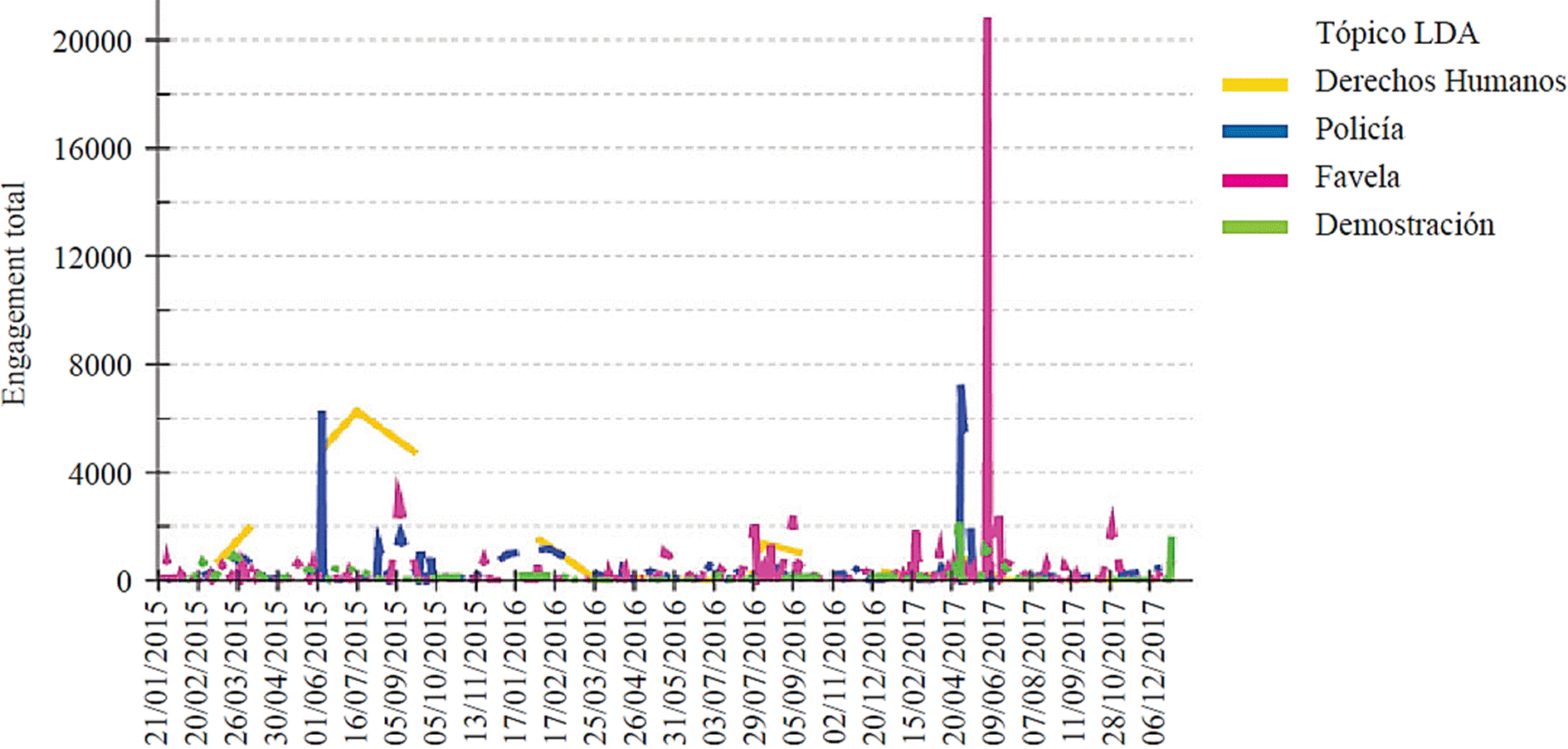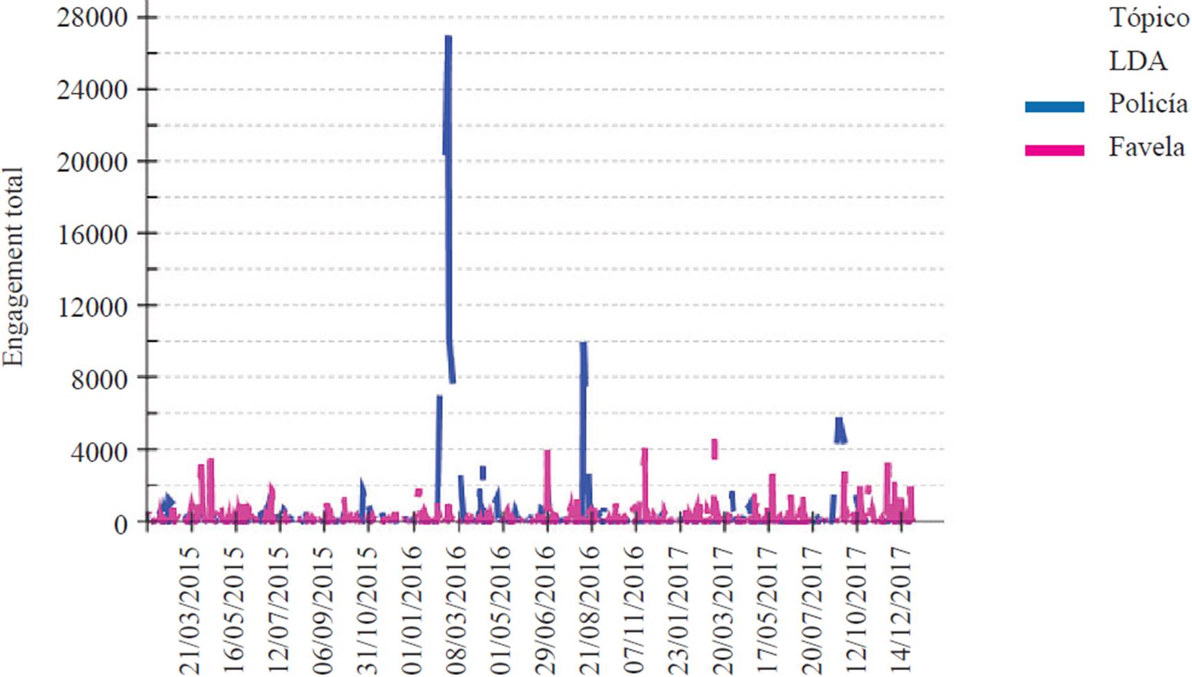Los colectivos de medios activistas analizados a menudo publicaron fuertes críticas a la policía (polaridad negativa) mientras que utilizaron el mismo espacio para resaltar lo que consideran aspectos culturales auténticos y valiosos de sus comunidades (polaridad positiva). La Figura 16 muestra que el tema Policía logró una interacción mucho mayor por parte de los usuarios en las fotografías en un solo día, pero Favela atrajo su atención con mayor frecuencia a lo largo del tiempo. Las referencias a la policía probablemente aparecieron con una frecuencia mayor en los días en los que hubo operaciones de las fuerzas estatales en la comunidad. Para una comparación entre páginas, la Figura 17 muestra que el engagement de los usuarios en las fotografías se distribuye de manera más equitativa en diferentes temas que en los eventos.