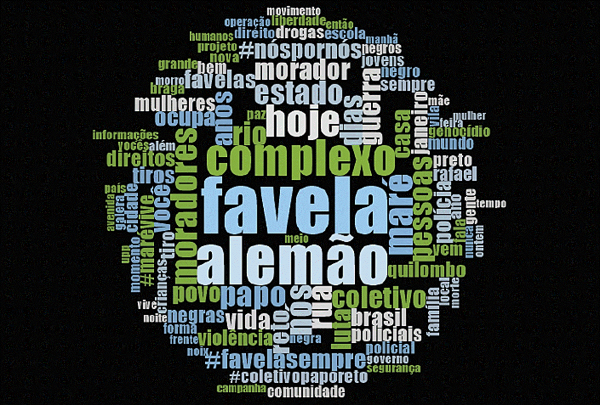Los conjuntos de datos reunieron 2 319 fotografías publicadas en los perfiles, tanto por las propias páginas como por otras. La nube de palabras construida con el vocabulario frecuente de las tres páginas (Figura 13) muestra que las publicaciones con fotografías a menudo hicieron referencia a sus comunidades; Complexo, Alemão, Papo, Reto, Maré, favela, moradores (residentes) y pessoas (personas) se encuentran entre las palabras más comunes, junto con luta (lucha), Estado y los hashtags #FavelaSempre ("Favela Siempre") y #NósPorNós ("Nosotros por Nosotros"). Una tendencia similar aparece en el vocabulario que acompañó a las publicaciones de videos.