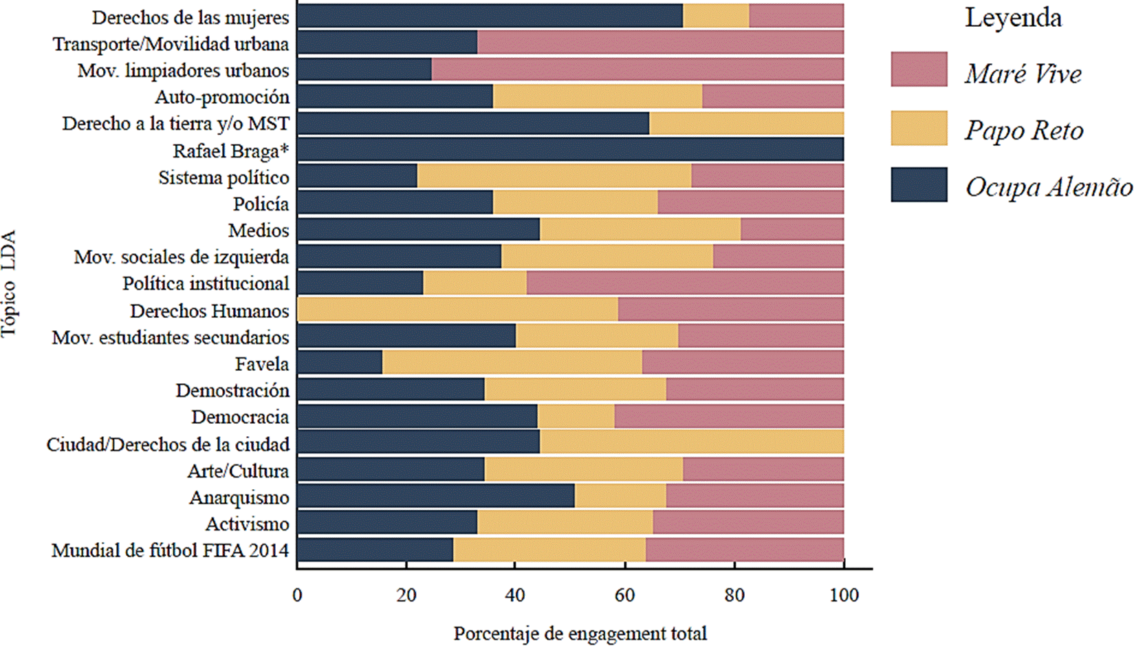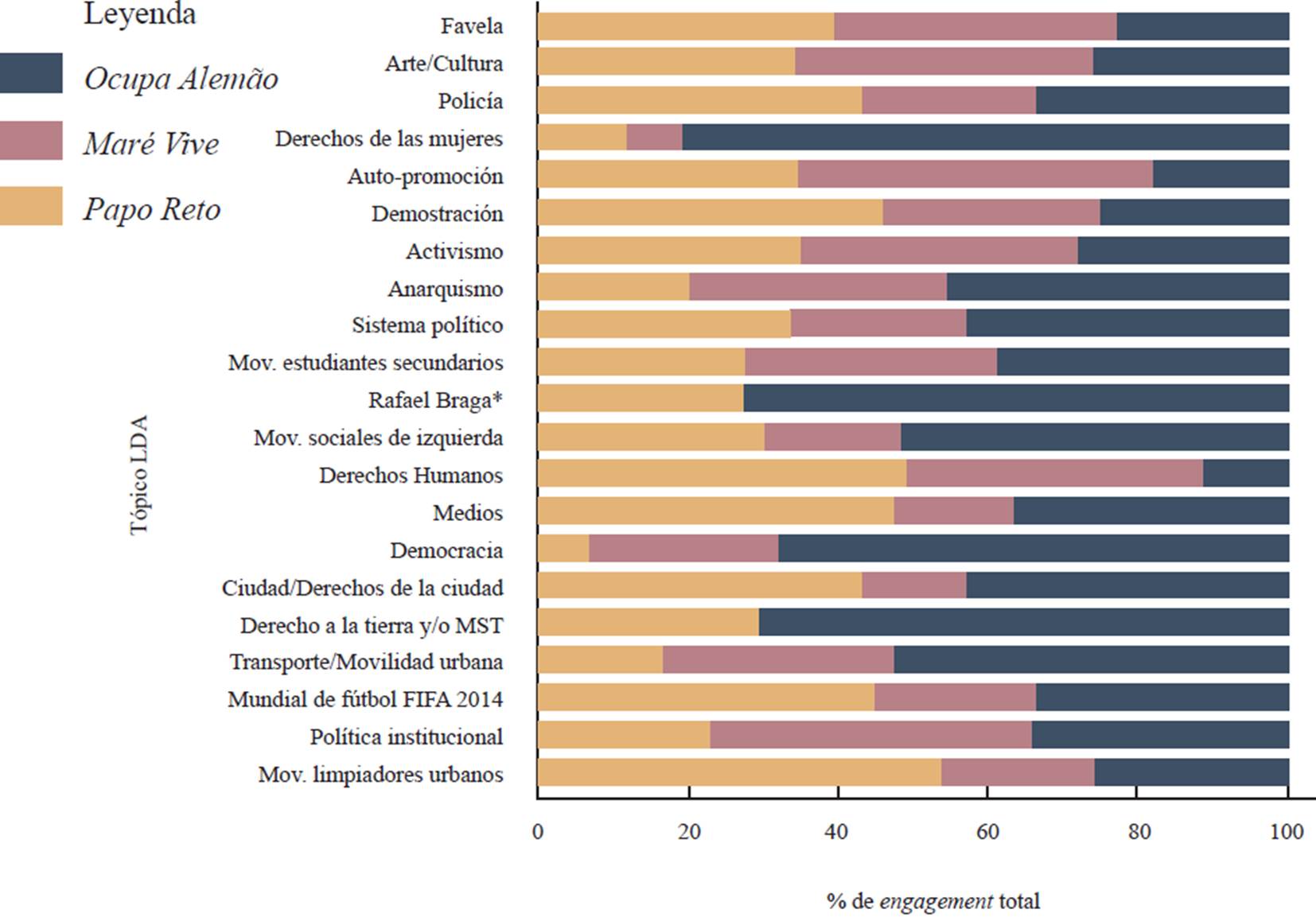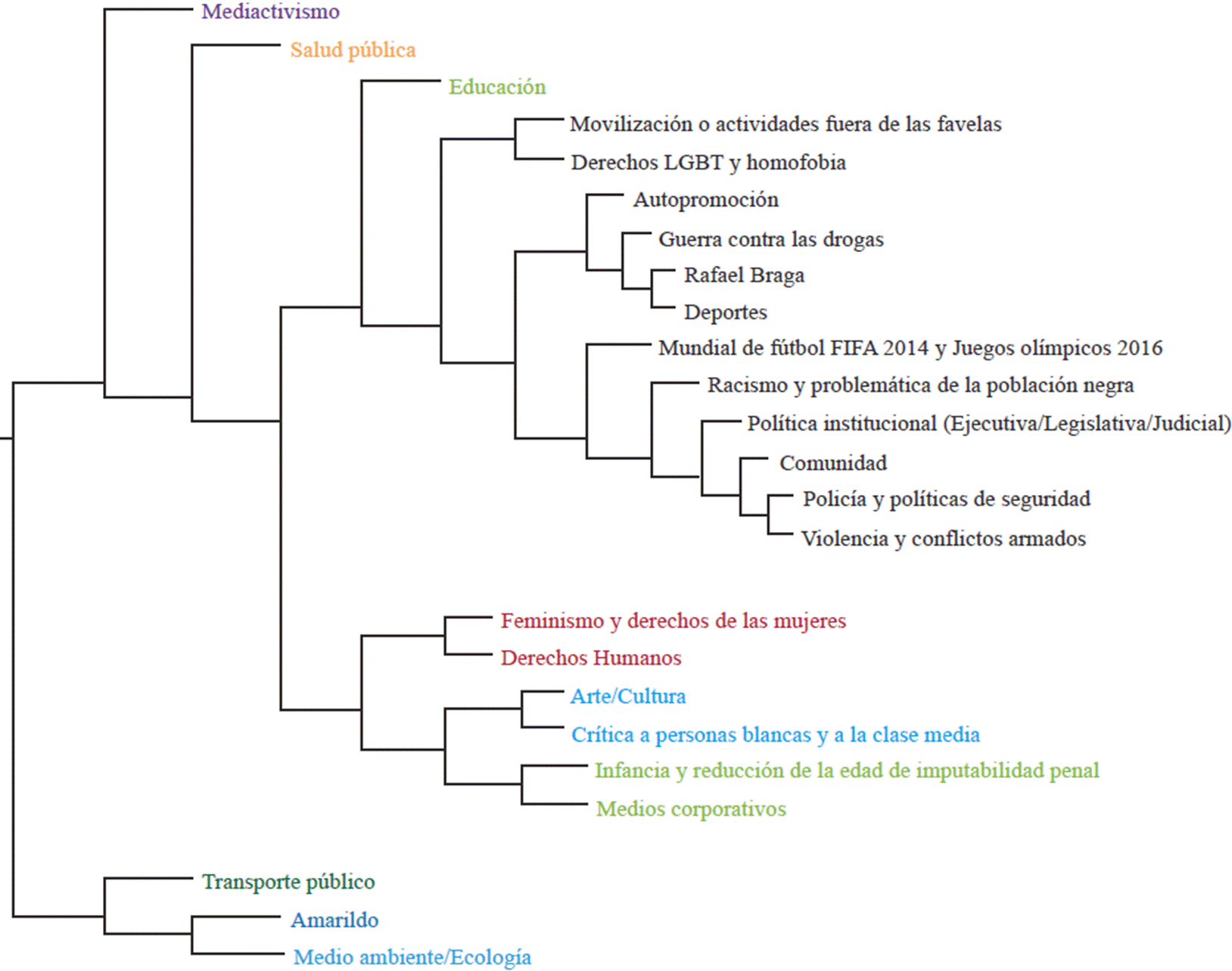 Nuestros análisis refuerzan las categorizaciones previas sobre los temas abordados por los medios activistas: la demanda por derechos, la identidad de la favela, el arte/cultura y las TICS, extendiendo dicho análisis a un enfoque basado en datos de medios sociales digitales. También evidencia la relación cercana de tales colectivos con los medios comerciales, lo que le agrega una comprensión más amplia de cuánta atención dirigen los usuarios a cada una de las fuentes externas.