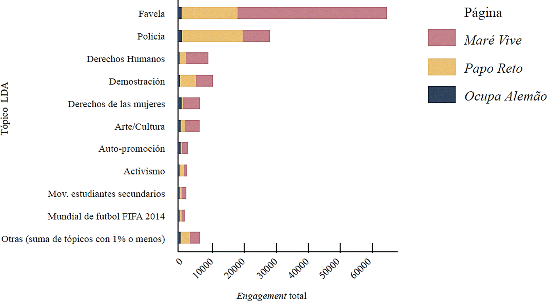 Maré Vive, Papo Reto y Ocupa Alemão tuvieron 240 publicaciones con convocatorias para eventos, ya sea por usuarios o páginas. De dichas publicaciones, las clasificadas en el tópico LDA Arte/Cultura atrajeron la mayor parte del engagement de los usuarios (Figura 10), aunque el tema Policía aparece con la tasa de engagement más alta en un solo día (Figura 11), además de un significativo engagement acumulado durante todo el periodo analizado. La Figura 12 muestra el engagement en eventos diseminados en las páginas. Las tres páginas contemplaron casi la mitad de los temas: Arte/Cultura, Favela, Auto-promoción, Policía, Sistema político, Activismo, Movimientos sociales de izquierda, Rafael Braga y Demostración.