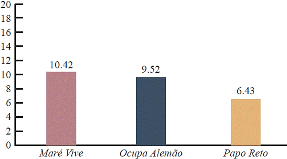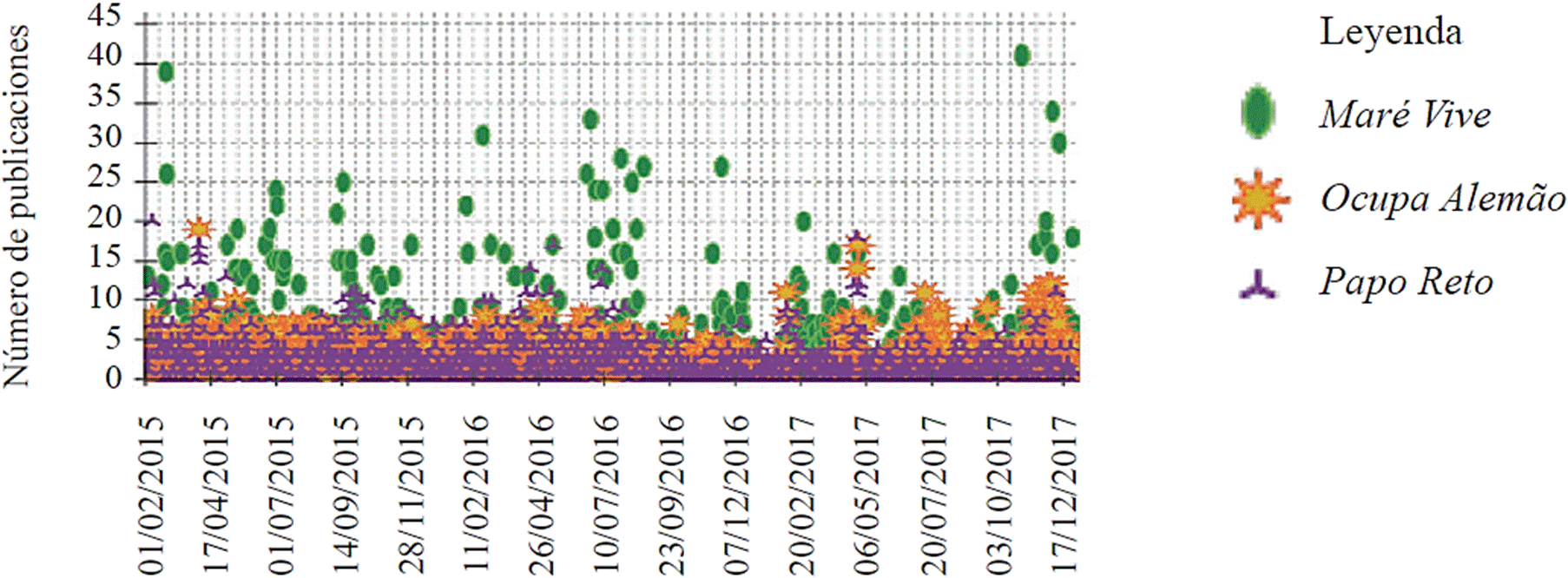Mientras que Papo Reto y Ocupa Alemão tuvieron frecuencias de publicación similares, Maré Vive mostró una actividad bastante más elevada, alcanzando más de 40 publicaciones en su día pico, en 2017 (Figura 2). Esto se debió principalmente a la actividad de los usuarios en el perfil de la página, responsable del 44.4% de todas las publicaciones en Maré Vive, lo que sugiere que el colectivo tuvo una relación más estrecha con su comunidad en comparación con los otros dos casos analizados. Las publicaciones de los usuarios fueron 28 veces más frecuentes en Maré Vive que en Ocupa Alemão y siete veces más frecuentes que en Papo Reto.