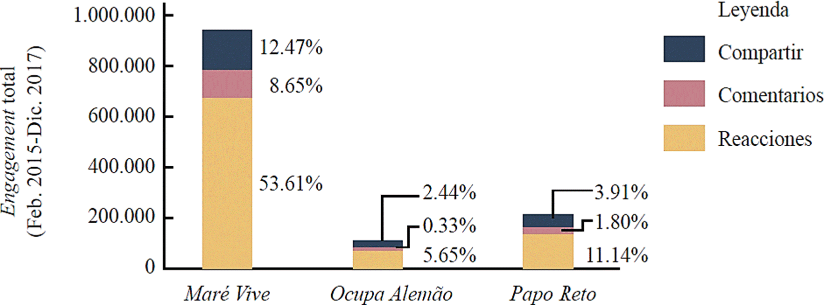 Durante el periodo analizado, Maré Vive también mostró tasas de engagement de usuarios más altas, alcanzando 26 772 interacciones en un solo día en 2016. Por su parte, Ocupa Alemão y Papo Reto mostraron tasas de engagement similares entre ellos, especialmente después de septiembre de 2015 (Figura 3). Más del 74% del engagement de las páginas se dirigió a la página de Maré Vive, que acumuló 939 987 likes, reacciones, comentarios y shares, entre 2015 y 2017. Papo Reto y Ocupa Alemão acumularon, respectivamente, 211 950 y 105 907 interacciones durante el mismo periodo (Figura 4). Aunque los usuarios de Maré Vive publicaron más del 40% de los posts en su página solo el 0.003% de todo el engagement se dirigió hacia ellos, lo que sugiere que los usos tácticos y estratégicos de las redes de comunicación digital son fundamentales para fomentar la participación de la comunidad.