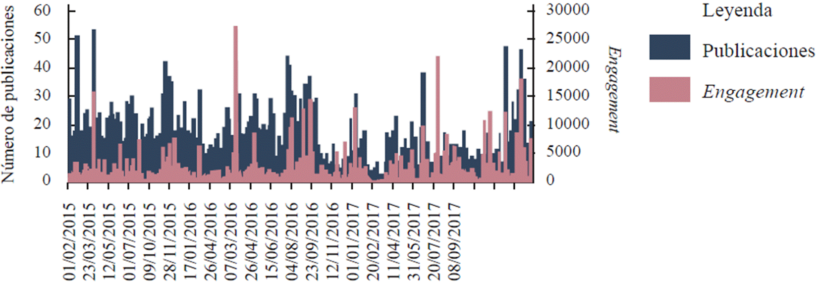 Optamos por centrarnos en diferentes gráficos de algunos indicadores (como tasa de engagement y número de publicaciones) y en la actividad de las páginas seleccionadas (como los tópicos populares y los dominios de enlace frecuentes). Las estadísticas por día proporcionadas por Netvizz ofrecieron una visión general de la actividad de las páginas analizadas, mostrando las relaciones entre las tasas de engagement (suma de likes, reacciones, shares y comentarios) y el número de publicaciones.