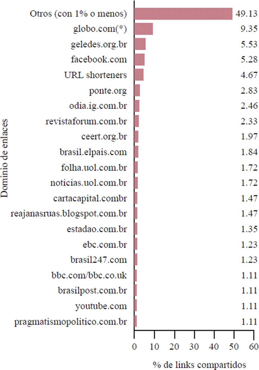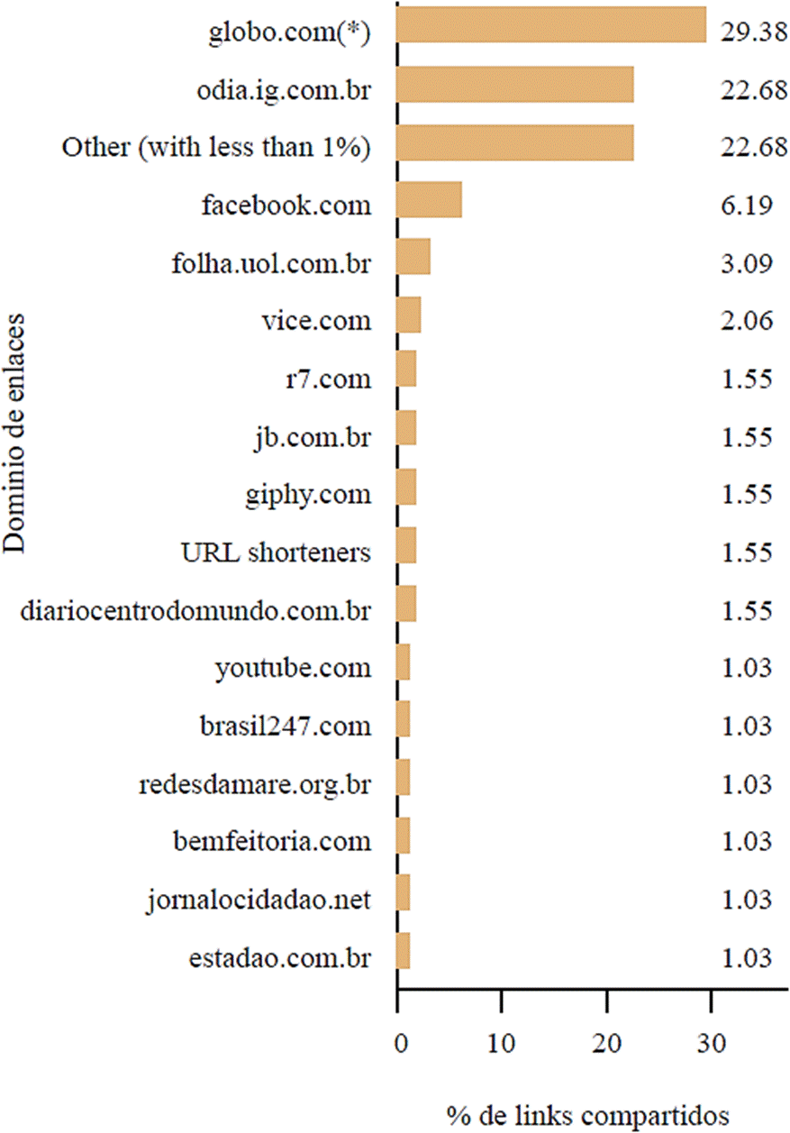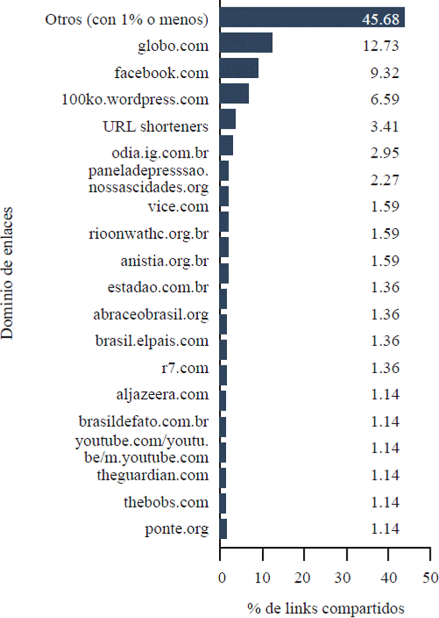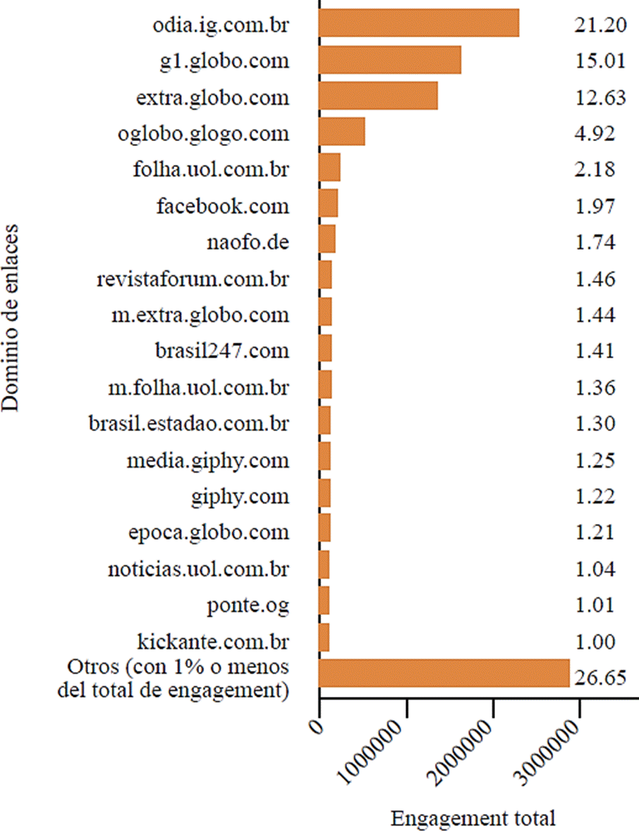 El dominio más constante, globo.com, también atrajo la mayor parte de la atención de los usuarios, con un 35.2% del total de engagement en publicaciones con enlaces, cuando se agregan todos sus subdominios. Otro dominio corporativo, odia.ig.com.br, también reunió más de una quinta parte de la participación de los usuarios (21.2%). Entre los 296 enlaces únicos con mayor engagement -con 120 hits o más (Figura 9)-solo revistaforum.com.br, brasil247.com, ponte.org y kickante.com.br no conformaban el ecosistema de medios comerciales.
