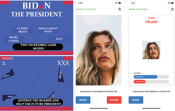 En esta identificación con los dos candidatos presidenciales se percibió que, en el caso de Trump, existen once aplicaciones “banales” que ofrecen emoticonos para dispositivos móviles, marcos de fotos o tuits controvertidos. Las nueve aplicaciones de los “trumpmojis” son todas muy parecidas entre sí. Por su parte, Biden suma doce apps triviales, siendo las de emoticonos y sonidos mayoritarias, aunque destacan algunas tan frívolas como Biden Celebration (The Global App Company, 2020) donde el jugador tiene que ir explotando los globos que caen del cielo a cañonazos para conseguir las trece banderas de Estados Unidos que hay delante de la Casa Blanca.