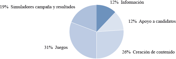 Las líneas temáticas se enmarcan en el contexto del proceso electoral (Figura 8). El primer elemento que destacó en este proceso es que, a pesar de que solo 22 apps fueron categorizadas como “Juegos” por sus creadores, se detectaron 32 (31.68%) que respondían a esa lógica. El siguiente gran bloque corresponde a la creación de contenido (stickers, memes o countdowns) con un cuarto del total de las apps (25.74%). La suma de ambas temáticas supera la mitad de la muestra (57.42%) y pone de manifiesto las aspiraciones lúdicas o jocosas de los contenidos expuestos que comparten con otras manifestaciones de las redes sociales (Zamora et al., 2021).