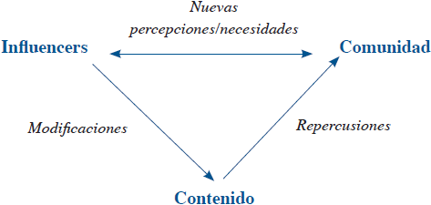 Si bien la relación entre influencer, comunidad y contenidos puede ser estratégica y enfocarse netamente en el ámbito comercial, bajo una coyuntura como la del COVID-19, parece adquirir un nuevo sentido de mayor compromiso cívico y social (Burgess & Green, 2009). Esto contribuye a matizar la visión crítica de una esfera pública digital alienada de los problemas públicos y la deliberación (Fuchs, 2021). El siguiente esquema (Figura 1) establece un sistema de elementos y vínculos que se confirman en las entrevistas a los influencers y que explican el impacto de un contexto singular como el descrito en este trabajo.