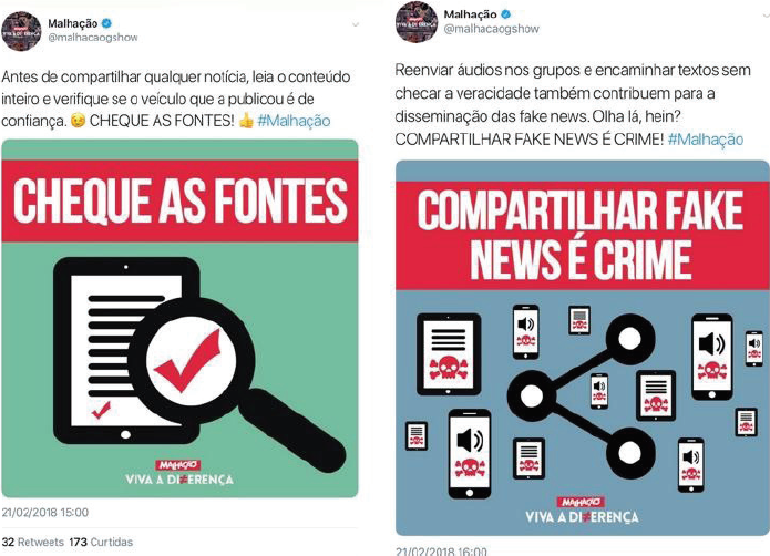 Durante la transmisión de Malhação: Viva a Diferença las acciones transmedia de la trama se daban en #MalhaçãoemTodasasTelas (#MalhaçãoenTodaslasPantallas) (Borges et al., 2019). Los contenidos profundizaban y ampliaban los arcos narrativos de la telenovela a través de los perfiles en las redes sociales (Facebook, Instagram, Twitter y Pinterest) y de videos y transmisiones en vivo en GShow. En las semanas finales del programa, Rede Globo lanzó una iniciativa que tenía como objetivo concientizar al público sobre las fake news. La estrategia de los medios de comunicación era un desdoblamiento del arco narrativo que incluía al Colégio Estadual Cora Coralina. En la historia, la escuela era el blanco de noticias falsas, las informaciones la difamaban declarando que los profesores exhibían contenidos pornográficos en las clases. Las fake news propagaban igualmente mensajes de odio a la comunidad LGBTQ+, haciendo principalmente apología del prejuicio de parejas homoafectivas con las afirmaciones “macho es macho”, “hembra es hembra”. Las publicaciones compartidas en el perfil17 de la telenovela en Twitter presentaban una especie de manual de buenas prácticas, subrayando la importancia de verificar las informaciones antes de compartirlas en las redes sociales y WhatsApp.