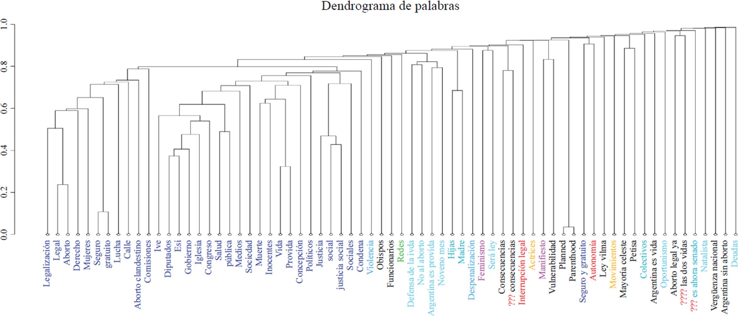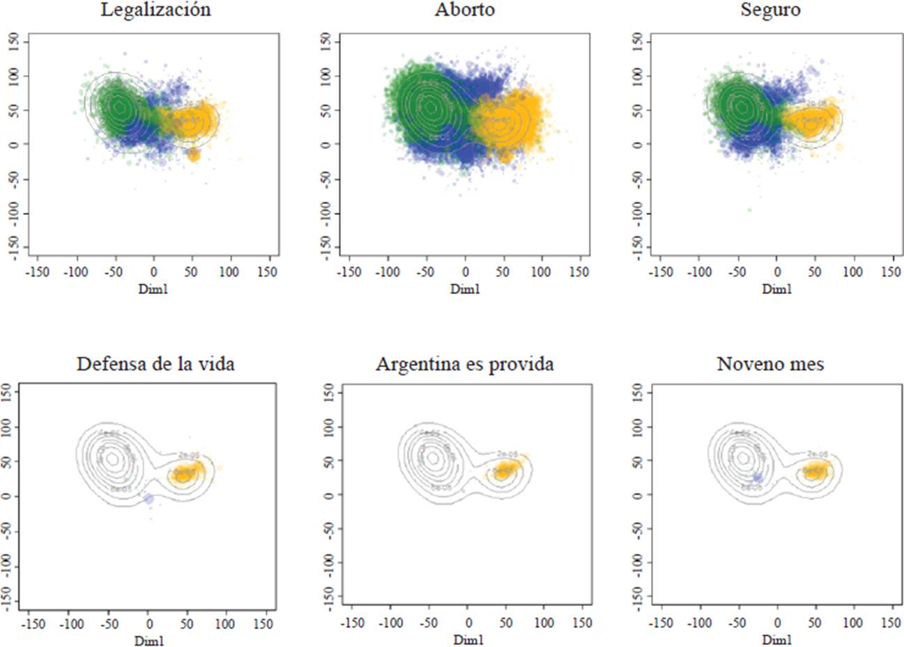Dada la especificidad del tema, gran parte de las palabras clave cumplieron una función de visibilización más que de identificación político-ideológica. Ello se evidenció, particularmente, en los términos que integran los elementos de los encuadres promovidos por las activistas feministas. En estos casos, ciertos términos que encuadraron el reclamo como ampliación de derechos (“aborto”, “seguro”, “legal”, “gratuito”, “derecho”) fueron compartidos en todas las comunidades. En cambio, las palabras más identitarias y agresivas, asociadas al contramovimiento celeste (“vulnerabilidad”, “salvemos las dos vidas”, “ley vilma”, “vergüenza nacional”, “inocentes” y “Argentina sin aborto”), generaron mayores niveles de disonancia, por lo que su activación fue más baja y selectiva.