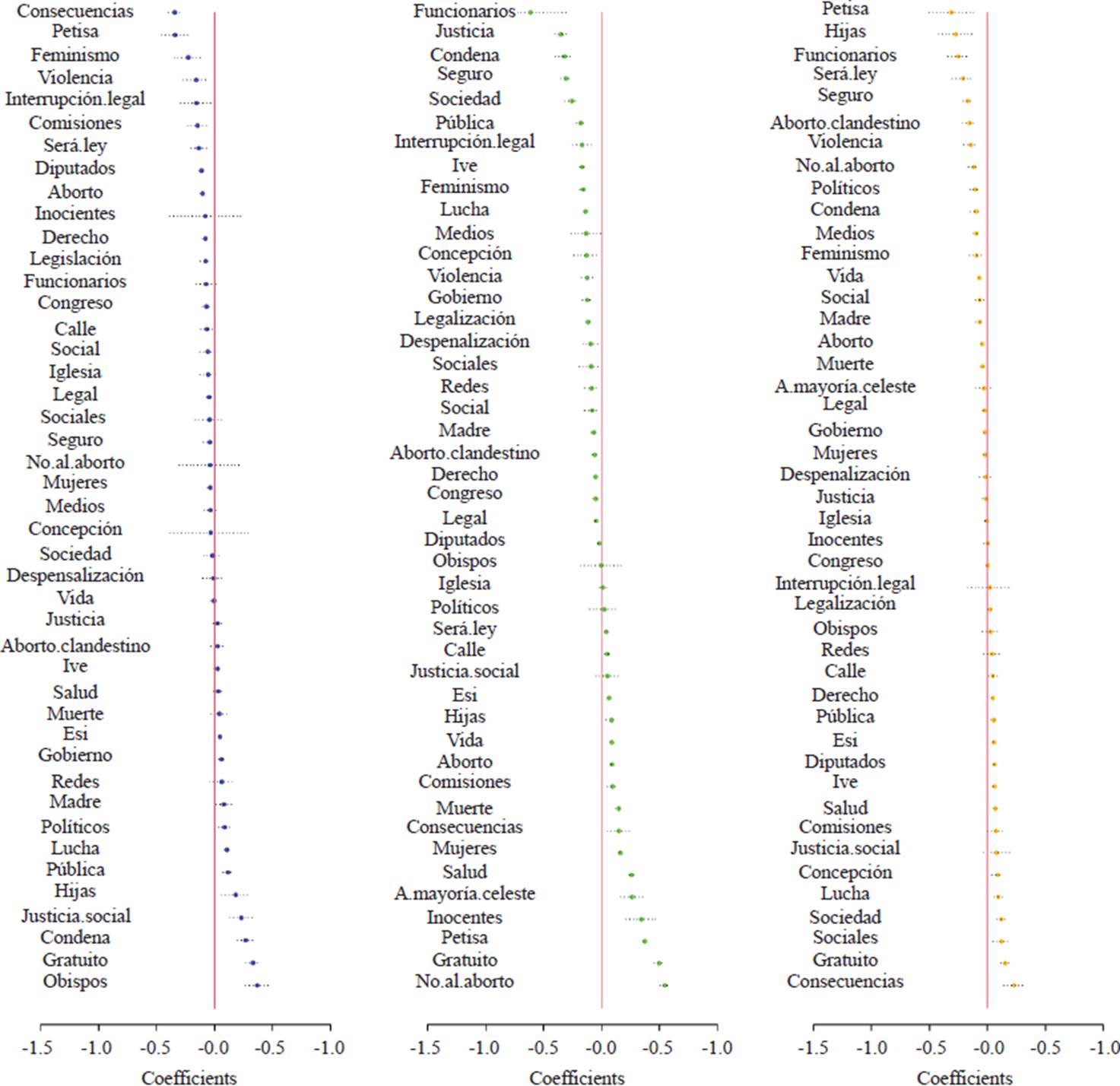En el diseño metodológico se aclara que la tasa de supervivencia se mide mediante los modelos proporcionales de Hazard Cox. Los coeficientes negativos indican tiempos de retuiteo más rápidos (es decir, un aumento en la tasa de riesgo), mientras que los coeficientes positivos sugieren tiempos más lentos. Para una interpretación intuitiva, consideremos el efecto de la covariable “legalización”, que presenta una latencia menor en las comunidades verde y del FdT (-0.116 y -0.078, respectivamente). En cambio, la propensión de los usuarios de la comunidad JxC/Celeste a compartir esta palabra clave se ralentiza, con valores positivos de 0.030. Lo propio se observa con la palabra clave “interrupción legal”, con valores negativos en las comunidades verde y FdT (-0.155 y -0.169, respectivamente) y una demora mayor en la burbuja amarilla (0.024). La Figura 4 sistematiza las estimaciones de todas las palabras clave asociadas a los elementos de encuadre seleccionados para este estudio. Con el objeto de facilitar la comprensión de las estimaciones, se presentan visualizaciones gráficas de todos los parámetros.