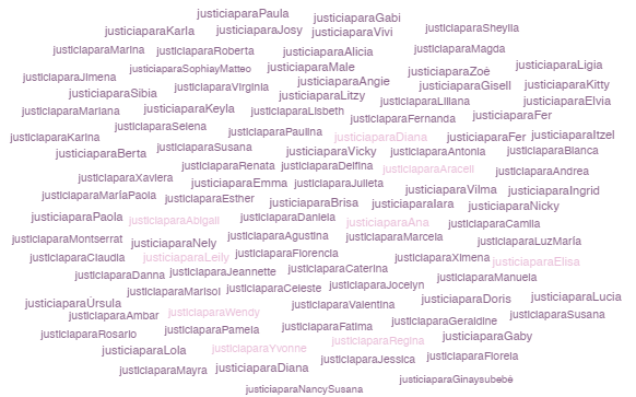 De la comparación que surge en la Figura 2 se pudo inferir que, mientras que la visibilidad de la lucha feminista contra la violencia de género (color rosado) adquiere alta visibilidad, que va en aumento hasta alcanzar puntos máximos el 25 de noviembre y días posteriores, podemos observar un patrón diferente en las demandas de justicia (color morado). En este segmento, la visibilidad se relaciona con la inmediatez de los casos ocurridos en ese período, pero no a una conmemoración o visibilización de asesinatos de mujeres ocurridos en el pasado. En estos casos, la co-ocurrencia entre los hashtags que demandan justicia y los más generales #niunamenos, #25N logran la visibilidad del caso y lo relacionan con otros.