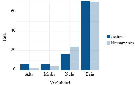 Los tuits que no particularizan casos se reparten entre hashtags generales como #justicia, #justiciaparatodas, y #justiciaparalasniñas. La diferencia entre el primer grupo y el segundo, es que solo los tuits que particularizan las demandas alcanzan visibilidad alta, media o baja. Los que piden justicia en términos generales se encuentran en el segmento bajo o nulo. Por este motivo, el análisis se centra en los tuits del primer tipo, mientras que los segundos se mencionan en los segmentos de baja y nula visibilidad.