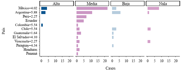 Correlacionándose con el nivel de acceso a Twitter y de activismo digital, los casos que se presentan en este segmento son en su mayoría diferentes. Dentro de la visibilidad baja se encuentran la mayoría de los casos de la muestra. Se localizan aquí 61, la mayoría de ellos reportados como feminicidios, de los 96 casos identificados. Corresponden en su mayoría a casos no recientes, no mediáticos e impunes, a noviembre de 2021. También son más los países que presentan casos en este segmento (ver Figura 3).