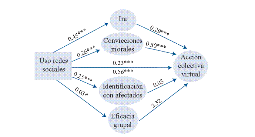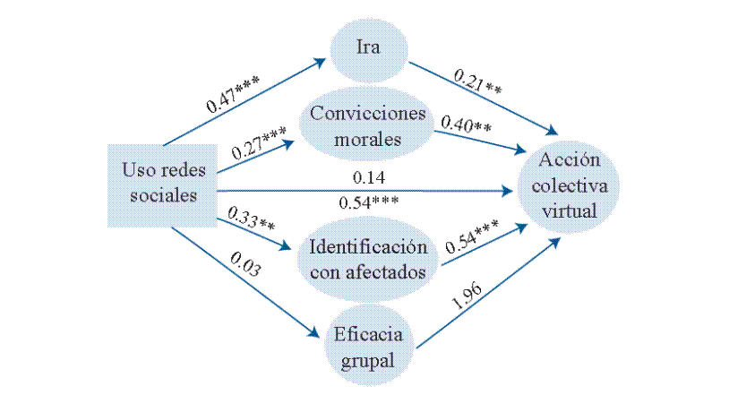 En lo referente a la identidad, se aprecia que solo la identificación con los activistas (Modelo de regresión 4) fue una buena predictora de la acción colectiva virtual. Este hallazgo confirma lo encontrado en otras investigaciones en las cuales la identificación con los individuos que protestan contra el cambio climático predijo la participación en una acción colectiva (Brügger et al., 2020; Van Zomeren et al., 2019; Wallis & Loy, 2021). Asimismo, se observó que este tipo de identidad era un buen mediador entre el uso de redes sociales y la acción colectiva virtual contra el cambio climático (Modelo mediacional 4). En las redes sociales las personas comúnmente se asocian con individuos y/o grupos que comparten sus intereses y posturas políticas (Yarchi et al., 2021). También, se ha observado que el uso de los espacios virtuales para intercambiar información, discutir, etc., puede tener un efecto sobre la identidad política de los usuarios la que, a su vez, guía hacia la intención de participar en acciones colectivas (Alberici & Milesi, 2018). Respecto al presente estudio, dado que el cambio climático se conecta a la esfera política, el uso de redes sociales reforzaría la identificación política de los usuarios con los activistas, identidad que influiría en la intención de participar en una acción colectiva (Chan, 2017).