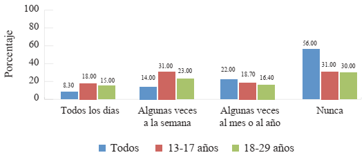 En la Figura 2 observamos qué géneros son consumidos en televisión. En primer lugar, podemos reconocer que el uso predominante de la televisión es informativo, un género que consume el 70 % de la población. Sin embargo, en el grupo que tiene entre 13 y 17 años ese uso disminuye al 46.1 %, y en el grupo que tiene entre 18 y 29 años disminuye al 62.9 %.