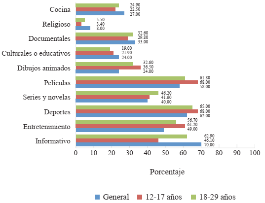 Si consideramos cuáles son los géneros más consumidos en televisión por el grupo que tiene entre 13 y 17 años, observamos que son películas (68 %) y deportes (68 %). Mientras que los más consumidos por los grupos que tienen entre 18 y 29 años son información (62.9 %) y películas (61.8 %).