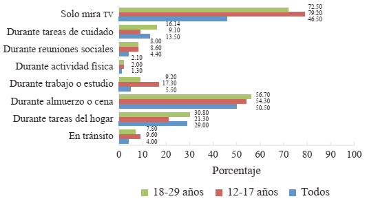 Los procesos de digitalización posibilitaron ciertas transformaciones de lugares, tiempos y rituales de uso que se expresan de manera diferencial en las modalidades de consumo de televisión ligadas tanto a rutinas cotidianas como a las condiciones y posibilidades que habilitan las nuevas tecnologías de la comunicación y la información. En este sentido, la encuesta 2022 permite observar que quienes más miran televisión sin realizar otras tareas de manera simultánea es el grupo etario más joven. A su vez, tradiciones familiares ligadas al consumo en momentos del almuerzo o cena, que suelen ser momentos de reunión, alcanzan porcentajes similares en todos los grupos etarios.