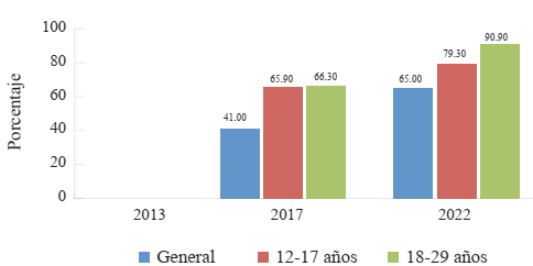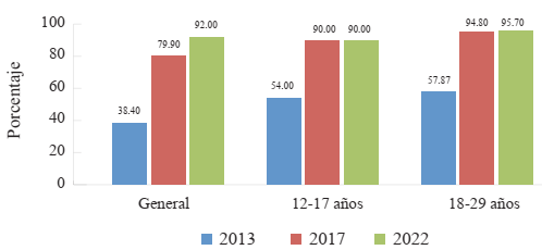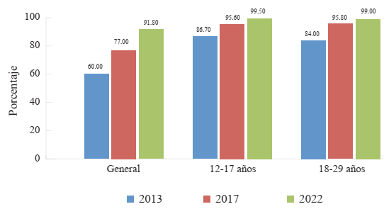 Comprender las dinámicas de consumo mediático ligadas a escenarios marcados por los procesos de convergencia -esto es, de las transformaciones en las prácticas de consumo ligadas al proceso de digitalización por el cual los servicios de comunicación audiovisual que tradicionalmente se ofrecían en soportes analógicos comienzan a estar disponibles en plataformas digitales- trae nuevas complejidades a la hora de ser abordados empíricamente. Este proceso de transformación de las prácticas de consumo está atravesado, en primer lugar, por el uso de Internet. Como podemos observar en la Figura 7, existe un incremento sostenido que en 2022 alcanza al 91.8 % de la población. En diez años, el uso de Internet sube un 30 %. Es destacable que el acceso a Internet entre los grupos etarios jóvenes es más alto y casi universal.