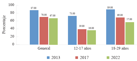 En relación con la televisión, observamos que en los últimos diez años existe una disminución del 6 % entre quienes la consumen. Sin embargo, si analizamos al grupo que tiene entre 13 y 17 años, la disminución es del 11.1 %; en el grupo que tiene entre 18 y 29 años es aún mayor, del 14.1 %.
