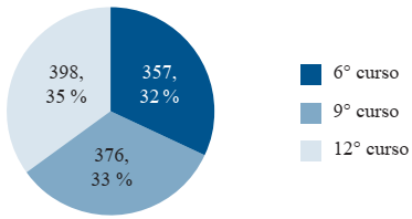 La muestra final consta de 1 131 niños y jóvenes con edades entre 11 y 19 años6 de 78 clases (26 de sexto curso, 26 de noveno curso y 26 de duodécimo curso). Como se muestra en la Figura 1, de la muestra total (N= 1 131), el 32 % (n= 357) cursan sexto, el 33 % (n= 376) noveno y el 35 % (n= 398) duodécimo.