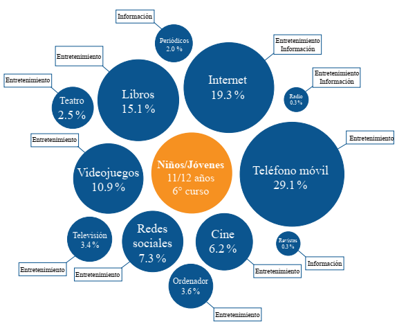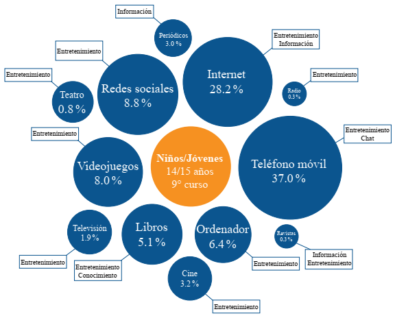 Entre las motivaciones señaladas por los alumnos de sexto curso, entretenimiento es la palabra más común asociada a cada medio. El conjunto de medios que definen como fuente de conocimiento son los libros, periódicos e Internet, aunque el entretenimiento también está vinculado a este último. Para los de noveno grado, al igual que para los de mayor edad, a los teléfonos móviles se añade otra función: la comunicación a través del chat.