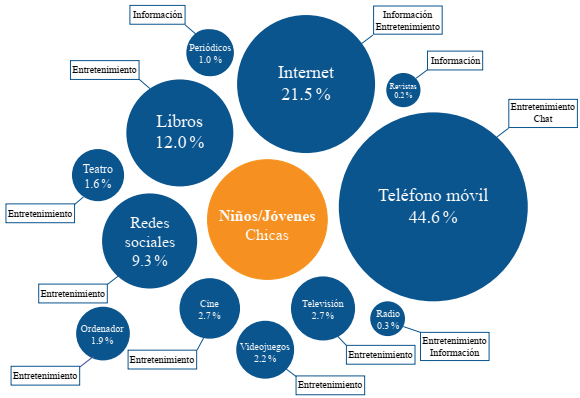 Internet es el segundo medio más mencionado por las chicas como parte de su repertorio y engloba las distintas formas de acceder al ciberespacio, mientras que para los chicos, Internet aparece como el principal medio preferido.
