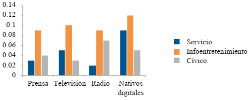En los otros dos roles las diferencias son menos fuertes (ŋ2infoentretenimiento = .004; ŋ2cívico = .016), y aparece más el rol de infoentretenimiento en los medios digitales y la televisión, y el rol cívico en la radio.