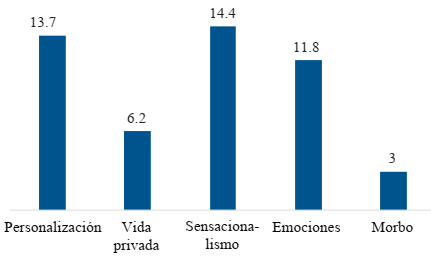 Respecto al rol de infoentretenimiento (Figura 3) destacan los indicadores relacionados con el estilo de las noticias: el recurso más presente son las emociones verbales, seguido del sensacionalismo. En la dimensión relacionada con los tópicos, el indicador más frecuente es la personalización, seguido de lejos por la presencia de noticias sobre la vida privada de los individuos.