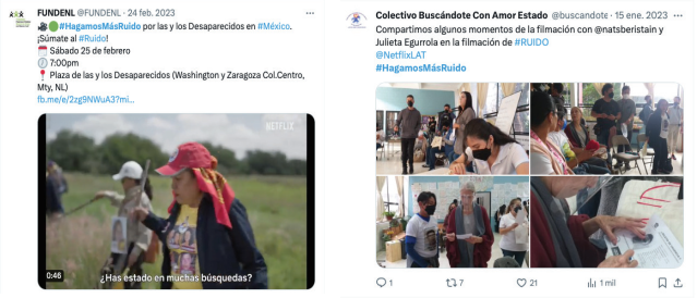 A la par, las propias familias buscadoras realizaron proyecciones de Ruido en espacios públicos significativos para sus procesos de búsqueda. Incluso, en alianza con la directora Natalia Beristáin y Netflix, realizaron la campaña digital #HagamosMásRuido, que consistió en extender la discusión en torno al filme, tanto en redes digitales como en foros públicos donde las madres buscadoras dieron sus testimonios de búsqueda.