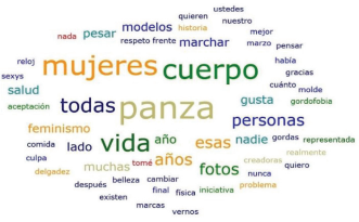 Como se aprecia en la Figura 1, la palabra identificada con mayor frecuencia es panza, repetida ocho veces y, a su par, la palabra cuerpo. También se identifica la palabra mujeres con siete menciones y, en quinto lugar, con una frecuencia de seis veces, la palabra vida. Si bien son las expresiones que más resaltan en la figura, hay otras que también forman parte de los significados del cuerpo, como feminismo, fotos, todas, personas, modelos, salud, años, muchas, entre otras.