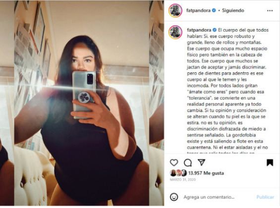 Por otro lado, @fatpandora reconoce que su activismo tiene lugar gracias a lo colectivo; con una fotografía que muestra su torso semidesnudo, narra cómo siempre quiso una imagen en la que se mostrara su cuerpo con ropa interior, pero que solo se atrevió a realizarla con un fotógrafo de confianza. Un aspecto importante que agrega es que nunca tuvo la intención de publicarlo, sino que era algo para ella misma: “Nunca la publiqué, era una foto para mí, para capturar un instante de mi vida en el que hice algo que era difícil y pensé que así se quedaría para siempre” (Convers, 2020b). Esto da a entender que sus sentimientos simbólicos, expresiones dotadas de significados subjetivos por su parte al ejercer el activismo, siguen en proceso de autorreconciliación con su cuerpo. Por ello, no publicó la imagen hasta que la contactaron para formar parte de la iniciativa titulada #TodoCuerpoEsValioso, creada por los activistas @leocorro2 y @burn_thisway3 de México, que ha generado un total de 8874 publicaciones en la plataforma de Instagram.