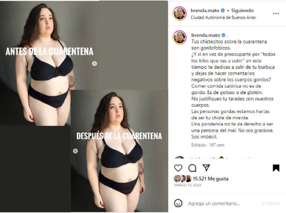 Las tres activistas, en este contexto, han adoptado diferentes sentidos y significados en torno a su activismo. Mientras @lafatshionista y @fatpandora mantuvieron en marzo de 2020 un discurso de cuidarse de la Covid-19: “Recién salidita del horno con un mensaje para ustedes: ¡CUÍDENSE! Quédense en casa” (Arias, 2020a); “sobre todo por estas épocas de confinamiento en donde convivir 24/7 con la familia nos puede llegar a afectar la constante comparación” (Convers, 2020c), @brenda.mato mencionó dos cuestiones relevantes sobre la pandemia por Covid-19 y la gordofobia. En primer lugar, se evidenció una publicación con dos fotografías exactamente iguales, una con la frase: “Antes de la cuarentena” y la otra con el mensaje: “Después de la cuarentena”.