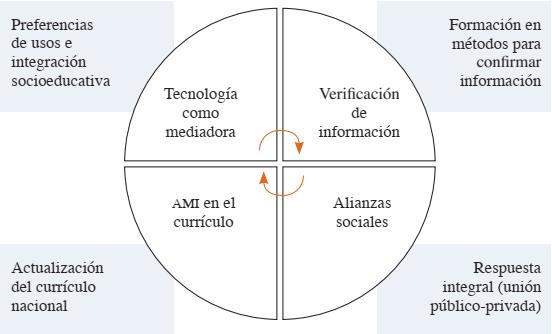 La literatura actual enfatiza que la AMI es un proceso continuo y de largo plazo, realidad que demanda propuestas más didácticas sobre habilidades digitales, en conjunto con políticas y esfuerzos gubernamentales (Fernández-Otoya et al., 2024). Por su parte, Frau-Meigs (2022) plantea algunos desafíos puntuales que inciden en la incursión de la AMI como política pública: 1) corre el riesgo de reducirse a alfabetización periodística, 2) corre el riesgo de reducirse a la verificación de hechos, y 3) el discurso de desinformación corre el riesgo de reducir el énfasis en la información.