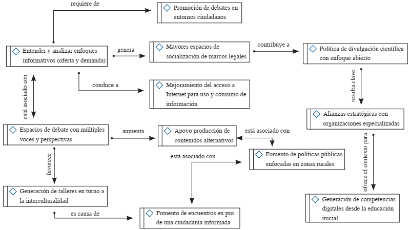 Respecto a las potencialidades descifradas por los participantes, se destaca la instauración de normativas como sustento para una comunicación digital y tecnológica: “Se necesita promover políticas públicas direccionadas a zonas rurales que faculten el acceso a Internet para un información oportuna” (Representante de Internews en eje temático 1), para garantizar que las comunidades, históricamente marginadas, cuenten con las condiciones necesarias para acceder a la información en tiempo real y establecer una equidad en pro de un acceso igualitario a la información y la educación.